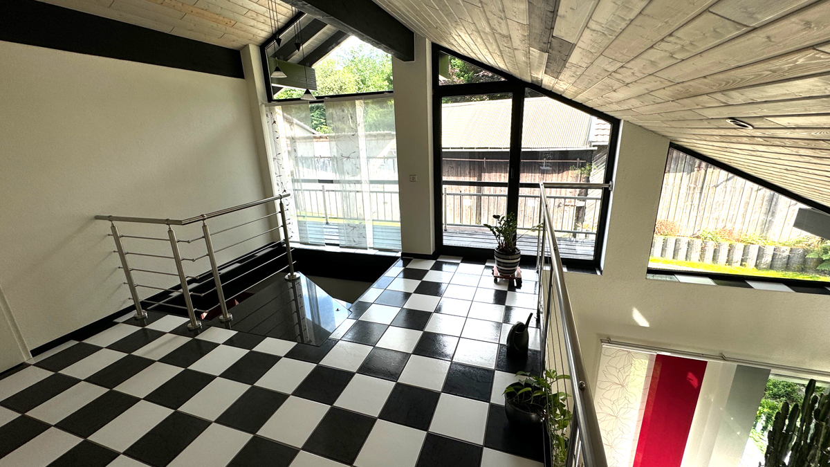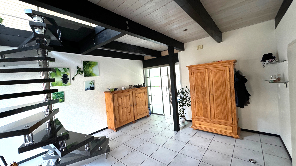 außergewöhnlicher und lichtdurchfluteter Wohn-/Essbereich mit offen angrenzender Küche (im Wohnbereich zur großen Galerie hin offen) mit Ausgang zu Terrasse und Garten bzw. Ausgang zum überdachten Durchgang zwischen Hauswirtschaftsraum, Garage und Stellplatz, ansprechendes Gäste-WC, Hauswirtschafts-/Lagerraum mit Durchgang zur Garage, großzügige u. repräsentative Eingangsdiele mit schwarzer Naturstein-Wendeltreppe ins DG (ebenfalls zur Galerie hin offen)