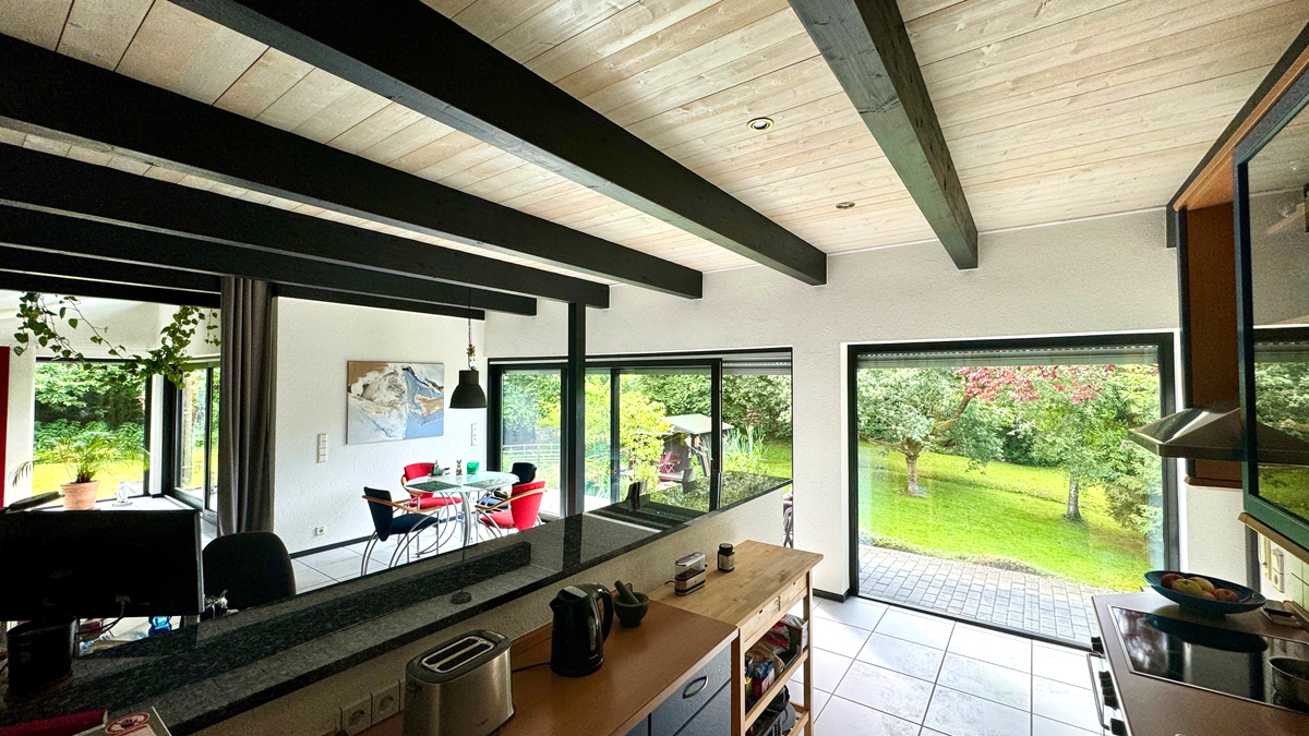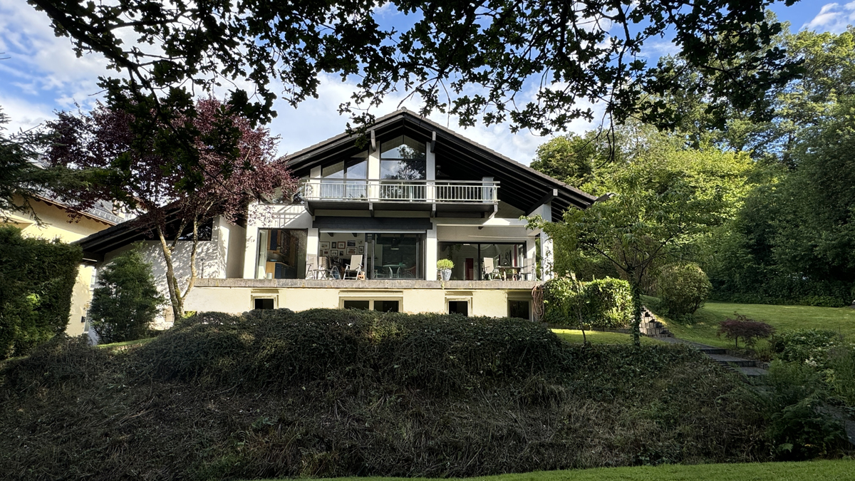 Das freistehende Anwesen wurde erst ca. 1996, abweichend vom Original, auf Kundenwunsch in architektonisch auffallender, 1,5-geschossiger Massiv-Bauweise mit Einlieger-Wohnung im Souterrain voll unterkellert errichtet. Das Anwesen verfügt über sämtliche typischen Stil-Elemente eines Holzständer-Hauses und bietet gleichzeitig alle Vorzüge eines Massivhauses. Die äußerst großzügige und offene Gestaltung der Immobilie inkl Sichtbalken, großer Eingangsdiele, offener Galerie und großflächigen, überwiegend bodentiefen Fensterelementen (die Rollläden sind natürlich elektrisch) bietet attraktive und ansprechend ausgestattete Wohn- u. Schlafräume für anspruchsvolle Paare mit älteren Kindern, die die Räumlichkeiten im 2022 umfassend sanierten Tageslichtsouterrain als separates Einlieger-Apartment nutzen können. Die repräsentative Architektur und die aufwendige offene Wohnraumgestaltung in Verbindung mit dem herrlich sonnigen Garten inkl. Teichanlage, frisch renoviertem Gartenhaus inkl Terrasse, den diversen Freisitzmöglichkeiten, der großen Garage sowie 2 zusätzlichen PKW-Stellplätzen und dem schön angelegten Grundstück (Größe ca. 900 m² + zusätzliches Gartenland optional vom Eigentümer zu erwerben, zB für Tierhaltung) sorgen für die Unverwechselbarkeit dieses Anwesens. Die durchdachte Architektur garantiert herrlich großzügige und offene Wohnräume ohne dabei auf die Privatsphäre verzichten zu müssen. Die Nähe zur Natur und die idyllische Randlage garantieren ganzjährig herrliche Ruhe ohne dabei auf die Annehmlichkeiten einer offenen und lichtdurchfluteten Bauweise verzichten zu müssen.
