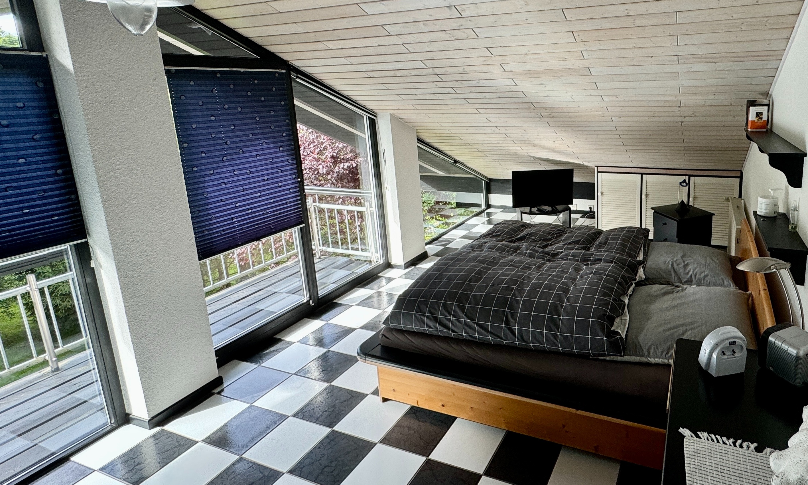 DG: große Galerie, kleines Arbeits-/Gästezimmer (aktuell Sauna, die Sauna kann mit übernommen werden) mit Balkon, großes Komplett-Bad, großzügiges Schlafzimmer mit kompletter Glas-Giebelwand und Ausgang zum Blickbalkon mit Aussicht in den Garten